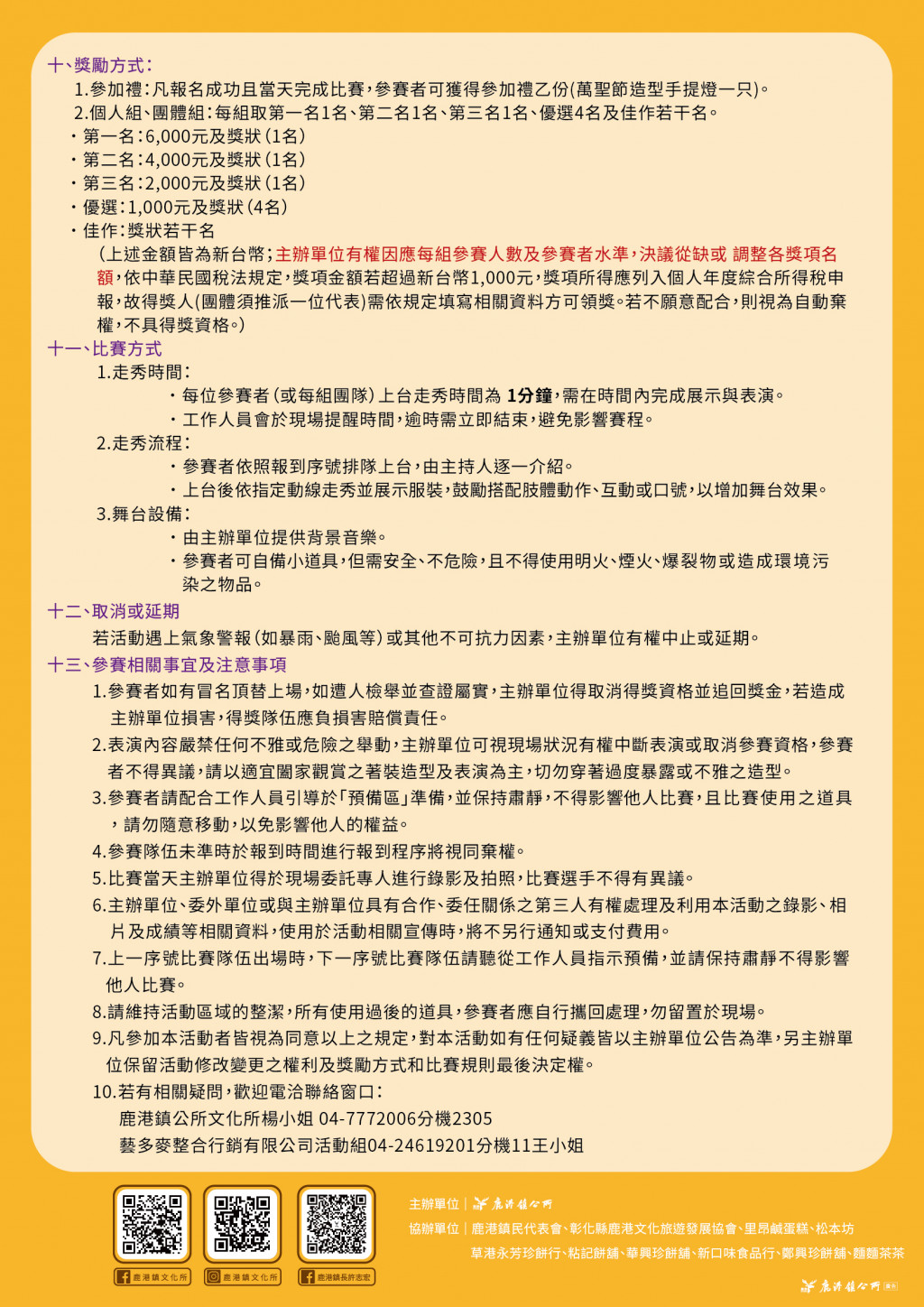 4、參賽者報到序號將於114年10月22日(三)公告於鹿港鎮文化所臉書粉絲專頁,敬請留意。
