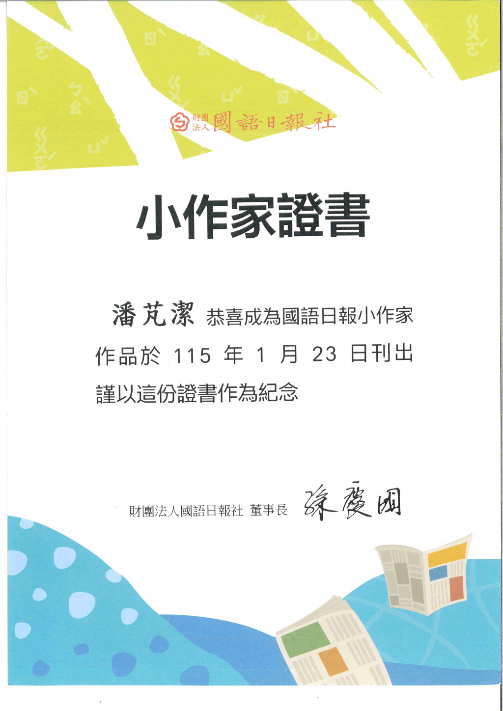 恭喜〜六年仁班潘芃潔同學 文章作品刊出於115.1.23(五)國語日報第9版,感謝施翔云老師辛苦指導,全體師生仝賀!