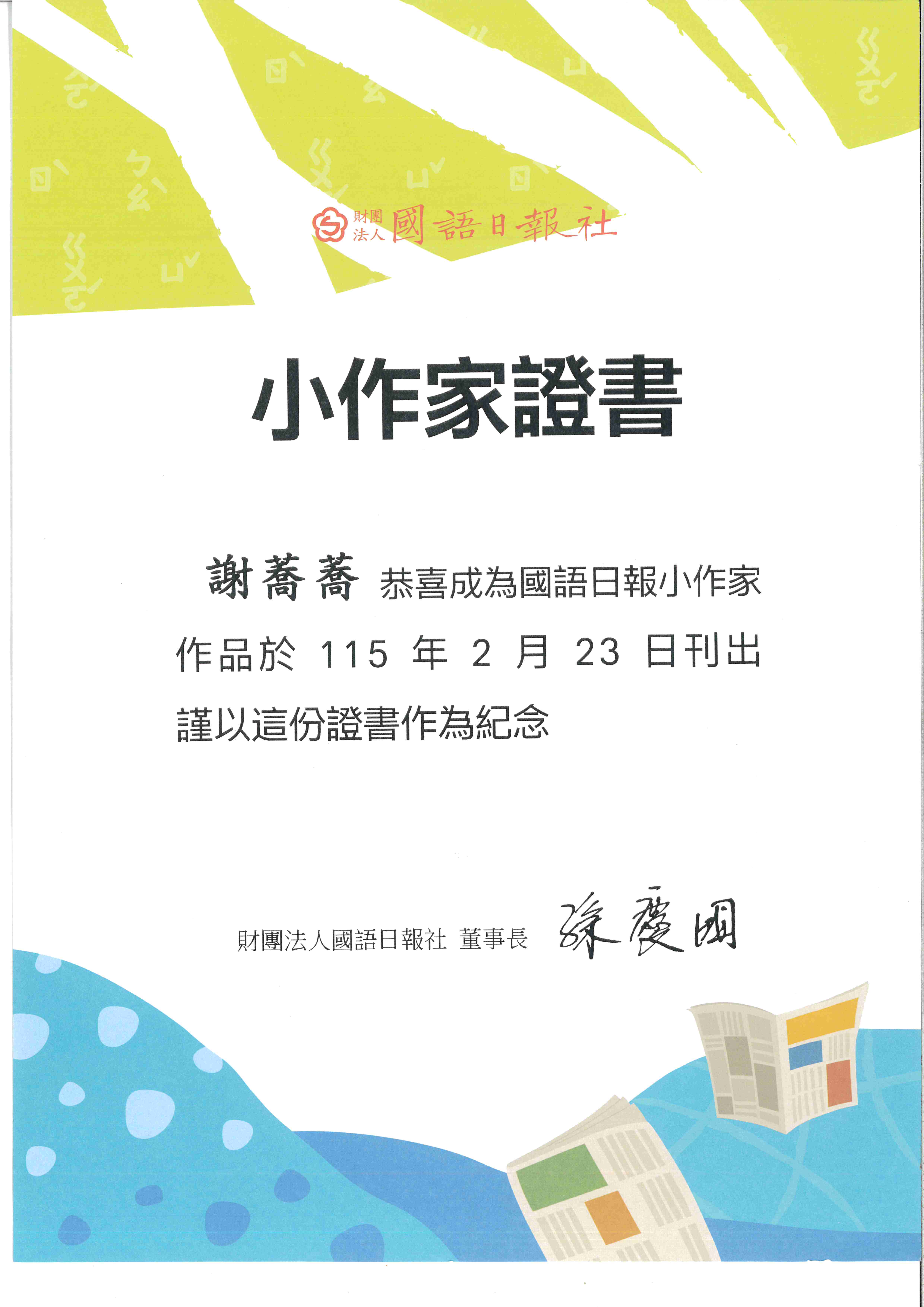 恭喜〜六年仁班謝蕎蕎同學 文章作品刊出於115.2.23(一)國語日報第9版,感謝施翔云老師辛苦指導,全體師生仝賀!