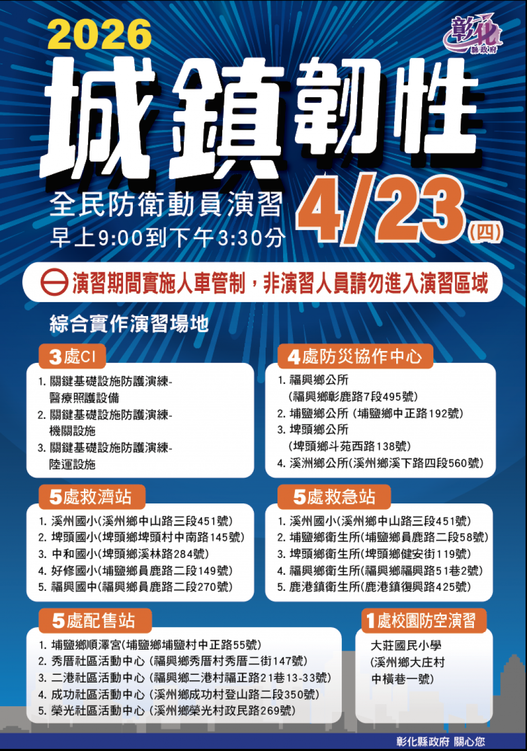 一. 彰化縣政府謹訂於115年4月23日(星期四)於福興鄉、埔鹽鄉、埤頭鄉、溪州鄉等4個鄉(鎮.市)辦理彰化縣2026城鎮韌性(全民防衛動員)演習。