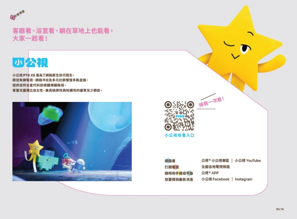 公廣集團8月推出台灣兒少專屬影音平台「小公視 PTS XS」,適時回應網路原生世代的兒少需求,同時透過公視+小公視專區、YouTube 平台、小公視社群,以及原本的頻道服務多軌並進,提供出符合當代媒體傳播路徑、尊重兒童獨立自主性、兼具娛樂性、知識性與陪伴性的優質兒少節目(請見附件1)。小公視官網:https://ptsxs.pts.org.tw/。 |